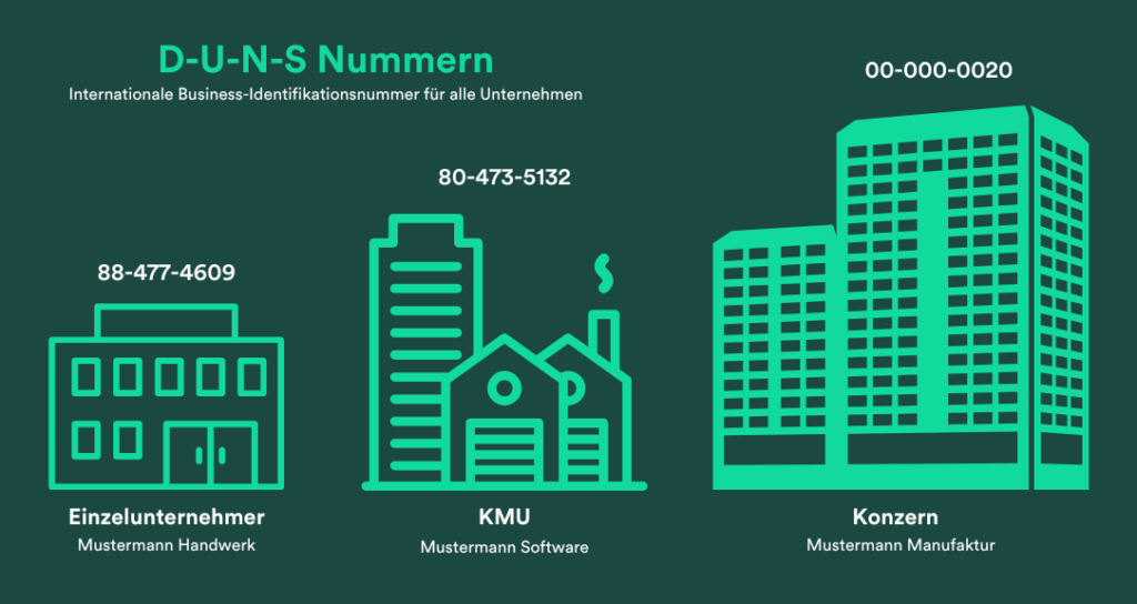 Die DUNS-Nummer (offizielle Schreibweise:D-U-N-S) ermöglicht es, Informationen über Unternehmen global und konsistent zu verwalten. Durch ihre Standardisierung bringt sie zudem Transparenz und Sicherheit in Geschäftsbeziehungen, da sie Daten wie den Firmensitz oder die Unternehmensstruktur eindeutig zuordnet.Wo kann ich die DUNS-Nummer finden?